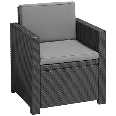 Der bequeme Lounge-Sessel Monaco von Allibert ist im modernen Rattandesign gearbeitet und besteht aus besonders UV- und wetterbeständigem Polypropylen. Die breiten Armlehnen und die hohe Rückenlehne schaffen einen besonderen Sitzkomfort. Bei Bedarf einfach mit feuchtem Tuch und milder Seifenlauge reinigen.