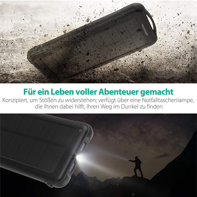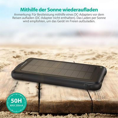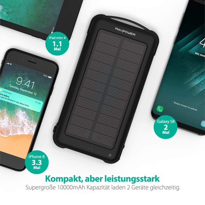 Die handgroße RAVPower Solar Power Bank kommt im kompakten Design und mit hoher Kapazität von 10000mAh. Der Lithium-Polymer-Akku kann zusätzlich per Solarenergie aufgeladen werden und ist damit perfekt für Reisen und längere Ausflüge geeignet. Dank der built-in LED-Lampe, kann die Powerbank auch als Taschenlampe in der Dunkelheit oder SOS für den Notfall verwendet werden.
