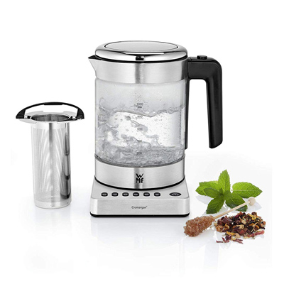 Heißes Wasser ist nicht gleich heißes Wasser beim neuen WMF Wasserkocher Vario. Fünf verschiedene Temperaturstufen machen jede Art von Wasserzubereitung möglich - dazu gehört auch die richtige Temperatur für Tee. Das gewisse Extra: die integrierte Teezubereitung mit Teebeutelhalter und Aroma-Mikro-Sieb. Einfach Tee ausgießen und genießen. Gefertigt aus hitzebeständigen WMF Glas, das den hochwertigen Eigenschaften von SCHOTT Glas entspricht, und mit einem Liter Fassungsvermögen ist der WMF Wasserkocher Vario die platzsparende Variante für die kleine Küche.