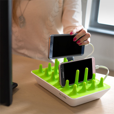 Mit dieser Ladehalterung laden und lagern Sie bis zu vier USB-fähige Geräte gleichzeitig, sicher und zuverlässig. Das stylische Design in der Trendfarbe Grün ist zudem ein Hingucker auf Ihrem Schreibtisch oder Nachtschrank. Die schützende Kunststoff-Schale hält die vier mitgelieferten Mikro-USB-Ladekabel sicher und geschützt im Inneren. Der weiche abnehmbare Silikon Aufsatz ist robust und schützt Ihre Geräte vor dem Verrutschen und vor Stößen. Dank der in der Länge variierenden Trennstäbe steht jedes Ihrer Geräte fest und stabil im universellen Ständer.