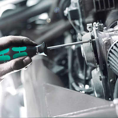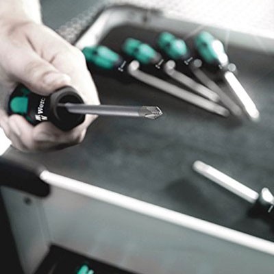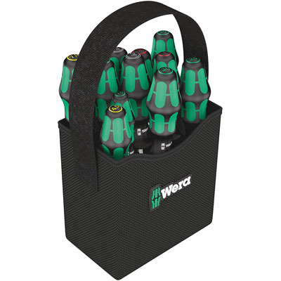 Der Wera Schraubendreher-Satz ist ein handliches und kompaktes 11-teiliges Set im Köcher Wera 2go 4. Es enthält zwei Schlitz-, vier Kreuzschlitz- und fünf TORX-VDE-Schraubendreher mit Lasertip-Technologie. Mittels Laserlichts wird eine scharfkantige Oberflächenstruktur an der Klingenspitze erzeugt. Die Laserbehandlung bewirkt eine Härte der Spuren von bis zu 1000 HV 0,3. Die microraue Oberfläche beißt sich im Schraubenkopf fest, sorgt für sicheren Sitz des Schraubendrehers in der Schraube und verhindert das Herausrutschen aus dem Schraubenkopf.
