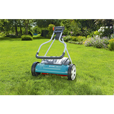 Der Gardena Comfort Spindelmäher 400 C ist ein umweltfreundlicher Spindelmäher der ohne Strom oder Kraftstoff auskommt. Das Prinzip ist einfach: Beim Schieben dreht sich eine mit Messern besetzte Walze an einem feststehenden Gegenmesser vorbei. Ähnlich wie mit einer Schere wird der Grashalm erfasst und abgeschnitten. Das Besondere: die Messerwalze und das Untermesser berühren sich nicht und ermöglichen dadurch ein angenehmes und geräuscharmes Arbeiten sowie ein leichtes Schieben. Die Schnitthöhe kann über einen Regler eingestellt werden.