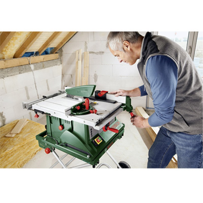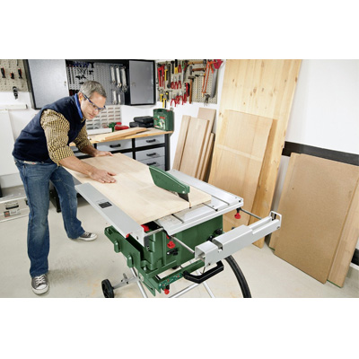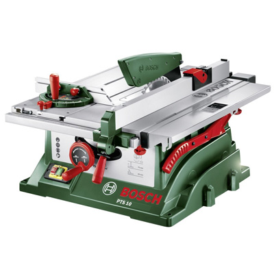 Die Tischkreissäge PTS 10 von Bosch hat eine Schnitthöhe von bis zu 75 mm. Der leistungsstarke 1.400-Watt-Motor eignet sich auch für härteste Anwendungen. Sie hat einen integrierten Schiebeschlitten mit Winkelanschlag für Gehrungen bis 60° - für exaktes Sägen breiter Werkstücke.