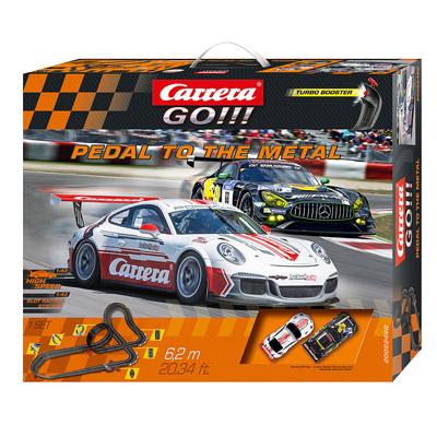 „Pedal To The Metal“ – hier ist der Name Programm! Die 6,2 Meter lange Carrera Autorennbahn bereitet die Rennfahrergeneration von morgen optimal auf ihre Motorsportkarriere vor und lehrt sie, die Nerven am Handregler zu bewahren. Dies ist vor allem nötig, wenn die PS-Starken Boliden, Porsche GT3 Cup und Mercedes-AMG GT3 auf der herausfordernden Rennstrecke mit Looping, Steilkurve und Highspeed-Geraden alles aus sich herausholen, um den Titel des GT Champions zu erlangen.