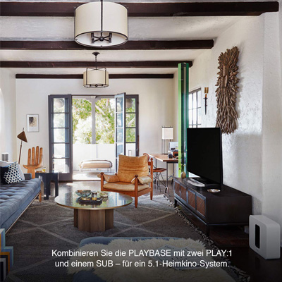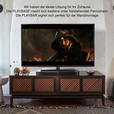 Kino Sound, der unter die Haut geht: Die Sonos Playbase vereint großen HiFi-Sound für TV, Filme und Games mit WLAN Musikstreaming über alle verfügbaren Dienste. Mit zehn verstärkten internen Lautsprechertreibern überrollt sie den Raum mit umwerfendem Heimkino Sound, der die herkömmlichen TV Lautsprecher weit übertrifft. Für das ultimative Surround-Sound-Erlebnis lässt sie sich einfach mit weiteren Sonos Speakern und dem Sonos Sub zu einem 5.1 Heimkinosystem verbinden. Mit ihrem unaufdringlichen Design fügt die Playbase sich perfekt in jedes Wohnzimmer ein und passt optimal unter jeden freistehenden Fernseher mit maximal 35 kg Gewicht.