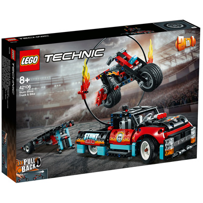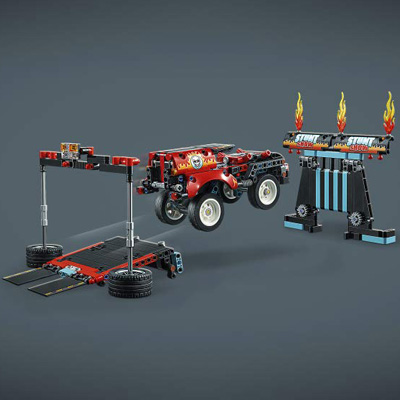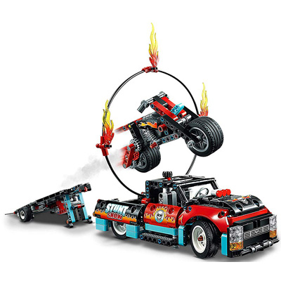Beim ultimativen Geschwindigkeitsstest geht es um Schnelligkeit, Können und Präzision. Zieh das Motorrad zurück, um es auf die Rampe rasen zu lassen. Sieh zu, wie es durch den Feuerreifen fliegt. Was für ein waghalsiger Stunt! Verwandle die Rampe einfach wieder in einen Anhänger und kopple ihn an den Truck an, um dein Motorrad damit zu transportieren. Lust auf eine neue Herausforderung? Baue das Lego Technic Modell Stunt-Show mit Truck und Motorrad in einen coolen Stadium Truck um.