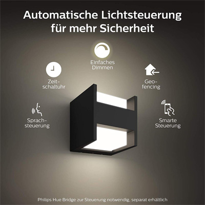 Fühlen Sie sich sicher: Mit dieser Philips Hue Leuchte mit energiesparender LED-Technologie können Sie das Licht im Außenbereich passend zum Sonnenstand oder zu bestimmten Uhrzeiten automatisch an- und ausgehen lassen. Zudem müssen Sie nie wieder im Dunkeln nach Hause kommen: Finden Sie den Weg zu Ihrer Auffahrt oder Haustür hell beleuchtet vor. Mit gedimmtem Licht können Sie zudem lange Abende im Freien entspannt ausklingen lassen.