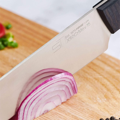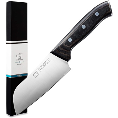 Das handliche Santokumesser von Silberthal mit herausragend scharfer Klinge ist zum mühelosen Schneiden von Fleisch, Gemüse, Fisch und Obst bestens geeignet. Die eisgehärtete Klinge aus hochwertigem, deutschem Stahl DIN 1.4116 X50CrMoV15 ist durch seine Zusammensetzung mit ca. 15% Chrom robust und verschleißfest sowie korrosionsbeständig und pflegeleicht. Der ergonomische Griff in eleganter Echtholzoptik sorgt für sicheren Halt und präziseres Schneiden von z.B. Gemüse, Fleisch, Sushi auch für Linkshänder.