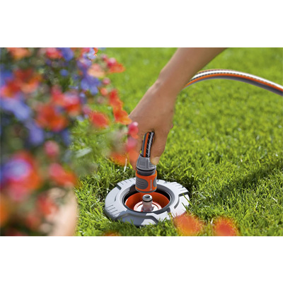 Mit der Gardena Wassersteckdose (8250-20) lässt sich Wasser aus dem Boden zapfen wie Strom aus der Steckdose. Die Wassersteckdose wird unterirdisch eingebaut und über 25mm Gardena Verlegerohre mit Wasser versorgt. Sobald man einen Gartenschlauch an den Wasseranschluss mit automatischem Stoppventil anschließt, fließt das Wasser. Wird der Schlauch abgezogen, stoppt das Wasser von selbst. Wenn die Wassersteckdose gerade nicht genutzt wird, schützt ein Deckel die Dose vor Verschmutzung. Dieser Kugeldeckel verschwindet beim Öffnen im Inneren der Wassersteckdose und ist somit auch beim Rasenmähen kein Hindernis.