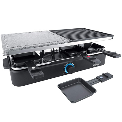 Das Raclette RC 18 von Steba bietet Platz für acht Raclette-Pfännchen. Die Grillfläche beträgt insgesamt 45 x 22,5 cm. Die antihaftbeschichtete Wende-Grillplatte aus Alu-Druckguß sorgt für gleichmäßige Wärmeverteilung und die hochwertige Natursteingrillplatte eignet sich optimal zum fettarmen Grillen. Die Bedienung erfolgt ganz einfach über einen beleuchteten Drehregler, so kann die Temperatur stufenlos reguliert werden. Die Pfännchen sind für leichte Reinigung antihaftbeschichtet. Für einen sicheren Stand sorgen rutschfeste Füße.