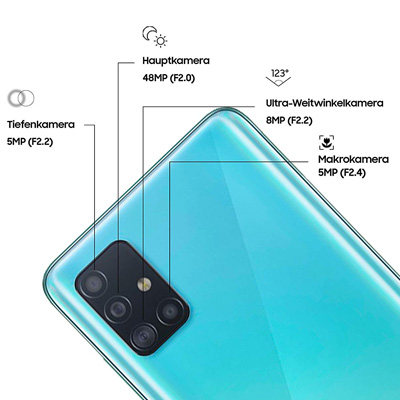 Das Samsung Galaxy A51 sieht nicht nur gut aus, sondern glänzt auch mit inneren Werten. Das minimalistische Design mit matter Oberfläche liegt gut in der Hand und schimmert in stylischen Pastellfarben. Zusätzlich zieht das große, brillante Display die Blicke auf sich. Das Galaxy A51 bietet dir das, worauf es im mobilen Alltag ankommt. Eine Berührung des Displays genügt, um das Gerät per Fingerabdruck zu entsperren und dir Zugang zu einer Welt voller Features zu verschaffen. Egal, ob scharfe Weitwinkelbilder, makellose Selfies oder detailverliebte Makro-Aufnahmen – das Galaxy A51 liefert dir hochauflösende Fotos. Bei dynamischen Action-Videos kann die Bildstabilisierung Verwacklungen vermeiden.