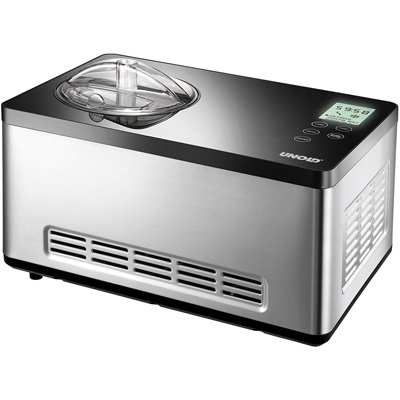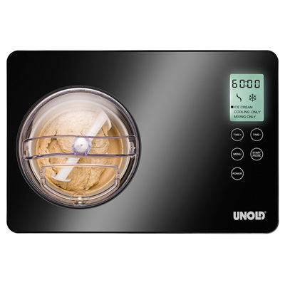 Die Eismaschine Gusto von Unold mit vollautomatischem selbstkühlendem Kompressor kann bis zu zwei Liter köstliche Eiscreme für eine ganze Feinschmecker-Familie auf Wunsch schnell und zuverlässig herstellen. Die Eismaschine Gusto sorgt mit einem Gefrierbereich mit bis zu -35°C für die richtige Temperatur und somit ist ein Vorgefrieren im Gefrierschrank nicht mehr nötig. Über die praktische Deckelöffnung der Eismaschine Gusto können die Zutaten ganz einfach hinzugefügt werden und über den digitalen Timer ist sie minutengenau einstellbar.