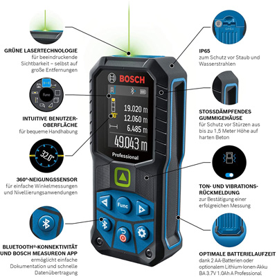 Der Bosch Laser-Entfernungsmesser GLM 50-27 CG Professional ist ein schneller, zuverlässiger und äußerst robuster Helfer für raue Baustellen. Sein IP 65-zertifiziertes Design umfasst ein schlagabsorbierendes Gehäuse, mit dem er Stürze aus 1,5 Meter Höhe übersteht, sogar auf harten Beton. Er zeichnet sich außerdem durch einfache Bedienung und schnelle Dokumentation aus.