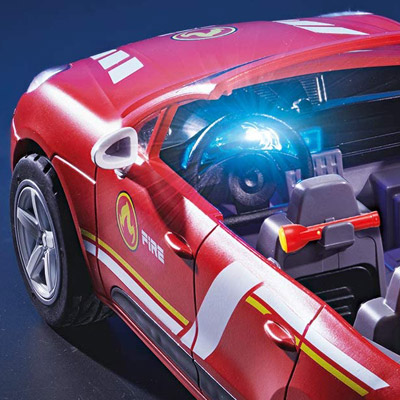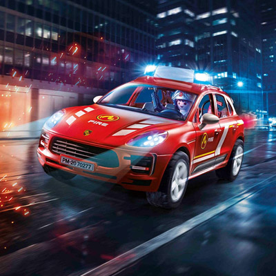 Im Notfall sind die Playmobil-Feuerwehrleute immer im Einsatz um Mensch und Tier aus der Gefahr zu retten. Wie könnte das tapfere Playmobil-Feuerwehrteam besser zum Einsatzort kommen als im blitzschnellen Porsche Macan S Feuerwehr?
