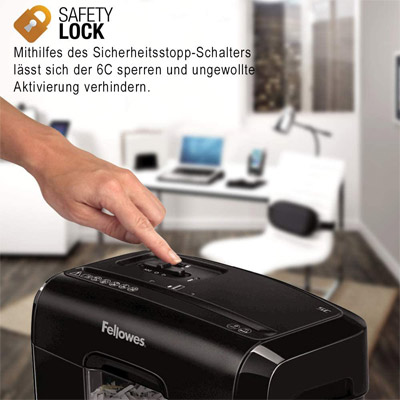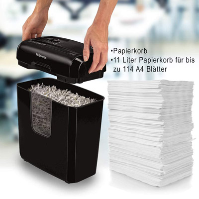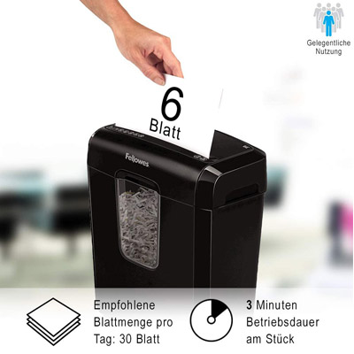Dieser schicke Aktenvernichter eignet sich perfekt für die gelegentliche Verwendung Zuhause. Er vernichtet 6 Blatt (70g/qm) gleichzeitig in 4 x 35 mm Partikel, was der Sicherheitsstufe P-4 entspricht. Der patentierte Sicherheitsstopp-Schalter sperrt den Aktenvernichter und verhindert ungewollte Aktivierung. Die Betriebsdauer beträgt bis zu 3 Minuten am Stück, bevor sich der Aktenvernichter in einen Abkühlmodus schaltet. Der 11 Liter Papierkorb verfügt über einen abnehmbaren Schneidaufsatz. Der 6C vernichtet auch Heft- und Büroklammern sowie Kreditkarten.
