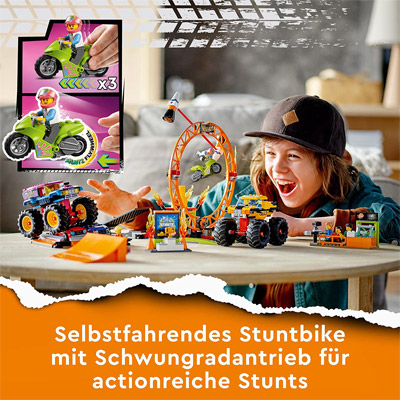 Mit Stuntz, der spannenden Unterreihe von Lego City, kannst du jede Menge tolle Stunt-Shows vorführen. Das Set Lego City Stuntshow-Arena (60295) ist ein Spielzeug für Kinder ab 6 Jahren und enthält ein schwungradbetriebenes Motorrad und Hindernisse für spektakuläre Stunt-Action. Kinder können das Stuntbike durch einen Feuerreifen springen lassen oder Rückwärtssaltos und Stunts mit 2 coolen Monster-Trucks und Autos mit eindrückbaren Dächern ausprobieren. Die Stunt-Module lassen sich für immer neue Vorführungen leicht umstellen. Das Lego -Set enthält 6 Minifiguren, inklusive den 3 Lego City TV-Charakteren Alex, Ann und Dynamo Doug, sodass du sie mit deinen Freunden teilen kannst.