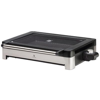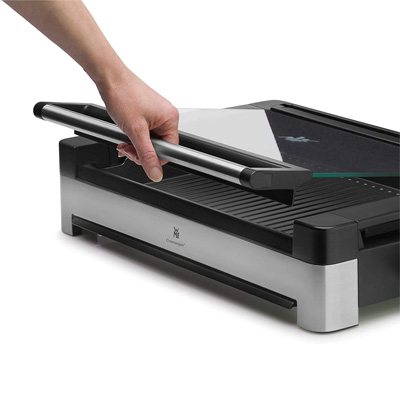 Der WMF Lono Tischgrill aus Cromargan mit gerippter Grillfläche vereint stilvolles Design mit einfacher Handhabung. 2.200 Watt, eine stufenlose Temperatureinstellung und die 40cm x 29cm große Grillplatte aus Aluminiumguss sorgen für beste Ergebnisse. Der transparente Glasdeckel dient zur Versiegelung des saftigen Geschmacks. Durch den Glasdeckel werden besonders zarte Grillergebnisse erzielt, ohne Austrocknen bei gleichzeitiger Bildung einer appetitlichen Kruste und das ganz ohne Fettspritzer auf dem Tisch. Eigengeschmack, Inhaltsstoffe und Form bleiben so bestmöglich erhalten. Damit man das Fleisch oder Gemüse problemlos auf den Grill legen kann, lässt sich der Glasdeckel um 90° aufgeklappt fixieren. Außerdem ist der Deckel abnehmbar und kann wie die Grillplatte auch, in der Spülmaschine gereinigt werden.
