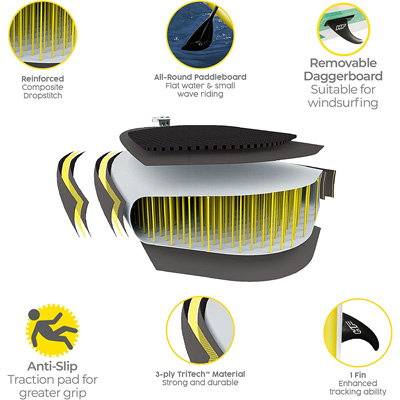 Für alle begeisterten Wassersportler und Standup-Paddel-Fans eignet sich dieses Hydro-Force SUP Allround Board-Set "Aqua Journey" von Bestway. Das umfassende Set beinhaltet ein aufblasbares Board mit einem coolen Design und ein längenverstellbares Aluminium-Paddel. Außerdem eine praktische Handpumpe und einen Transportsack. Die elastische Verbindungsleine lässt sich per Klettverschluss am Fuß befestigen und verhindert, dass das Board sich im Wasser selbstständig macht. Für den Transport lässt sich die Finne abnehmen. Das Board eignet sich besonders für Flüsse und flache Gewässer.