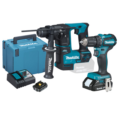 Das Makita Akku-Kombo-Kit DLX2454AJ besteht aus dem Akku-Bohrschrauber DDF483 und dem Akku-Bohrhammer DHR171. Beide Geräte nutzen die Akkukapazität durch Verwendung eines BL (Brushless) Motors noch effizienter als mit herkömmlichen Elektromotoren. Das 13mm-Schnellspannbohrfutter des Akku-Bohrschraubers DDF483 mit Spindelarretierung ermöglicht einen schnellen Werkzeugwechsel. Der Akku-Bohrhammer DHR171 für SDS-PLUS eignet sich zum Bohren und Hammerbohren. Die SDS-PLUS-Werkzeugaufnahme ermöglicht einen sehr schnellen Wechsel des Werkzeugeinsatzes. Außerdem verfügt der DHR171 über eine regelbare Drehzahl, Rechts-/Linkslauf, und einen Zusatzhandgriff mit Tiefenanschlag. Dunklere Arbeitsbereiche sind kein Problem, denn die leuchtstarken LEDs der beiden Werkzeuge bringt Licht auch in die dunkelsten Ecken.