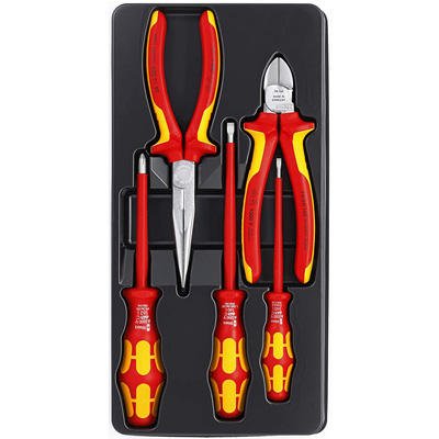 Der Knipex VDE-Werkzeugsatz bietet fünf VDE-geprüfte Werkzeuge, die Zangen sind verchromt, die Griffe mit Mehrkomponenten-Hüllen versehen. Die Werkzeuge werden im Kunststoff-Tiefziehteil mit transparentem Deckel geliefert. Der VDE-Werkzeugsatz enthält eine Knipex Flachrundzange mit Schneide, (Storchschnabelzange) 200mm, einen Knipex Seitenschneider 160mm, einen Wera Schraubendreher für Schlitzschrauben 0,6 x 3,5 x 100mm, einen Wera Schraubendreher für Schlitzschrauben 1,0 x 5,5 x 125mm und einen Wera Schraubendreher Kreuzschlitz PH2 x 100mm.