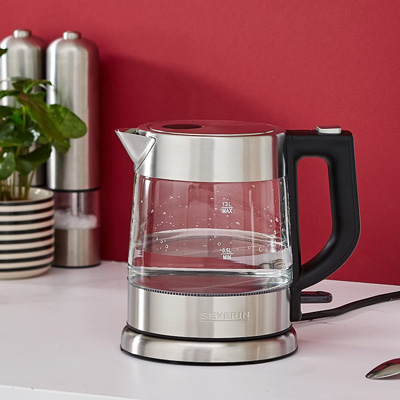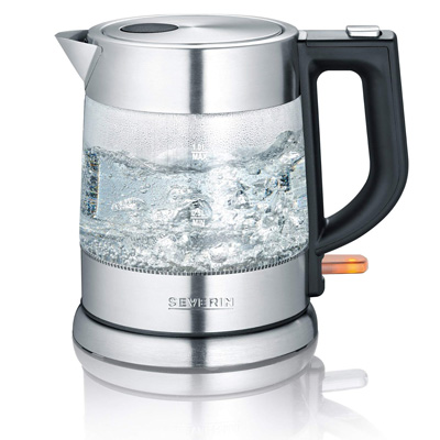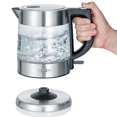 Der Wasserkocher WK 3468 von Severin ist ein kompakter, leistungsstarker Wasserkocher in hochwertiger Glas-Edelstahl-Kombination und 360° central-cordless system. Die 1-Hand-Bedienung ist praktisch und angenehm. Der integrierte Fingerschutz am Deckel, die Dampfstopp-Automatik und der Überhitzungsschutz sorgen für Sicherheit. Der Wasserbehälter lässt sich dank verdeckter Heizschlange (Abdeckung aus Edelstahl) und klappbarem Deckel mit großer Öffnung leicht reinigen und das Anti-Kalk-Sieb sorgt für sauberes Wasser beim Ausgießen.