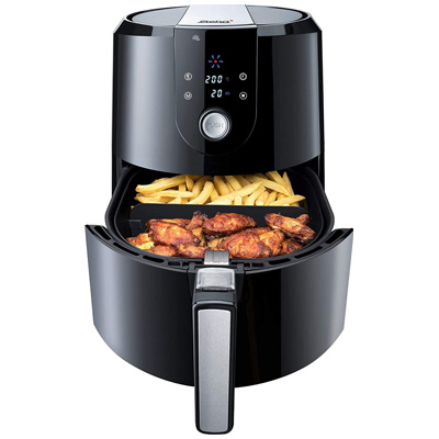 Mit der Heißluftfritteuse HF 5000 XL von Steba kann man energiesparend und mit bis zu 80% weniger Fett Frittieren, Backen und Grillen mit einem Gerät. Durch die Heißluft-Technologie verteilt sich die Hitze schnell und gleichmäßig. Der antihaftbeschichtete Frittierkorb hat ein Volumen von 5,2 Litern. Die Bedienung ist einfach, durch den Temperaturregler kann man die passende Temperatur einstellen und dann braucht man nur noch den Timer zu stellen oder man wählt eines der sieben Automatikprogramme z.B. für Pommes, Hähnchen oder Fisch. Mit dem Korbtrenner kann der Frittierkorb in 2 Teile getrennt werden. Damit kann man zwei verschiedene Lebensmittel gleichzeitig garen. Ein Sicherheitsmikroschalter ermöglicht die Kontrolle des Garguts während des Frittierens ohne Unterbrechung des Programms. Die Warmhaltefunktion hält fertige Speisen bis zu 120 Minuten warm.