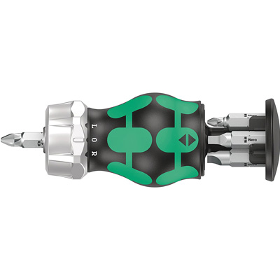 Der Wera Stubby ist ein besonders kleiner kompakter Schraubendreher mit kurzer Klinge für schwer zugängliche Bereiche. Das 7-teilige Set Kraftform Kompakt Stubby Magazin RA 1 enthält den kurzen Handhalter Stubby mit Ratschenfunktion und sechs BiTorsion Bits, die sich in einem Magazin im Handgriff befinden. Das schwenkbare Bit-Magazin ermöglicht die leichte Entnahme der Bits in nahezu jeder Situation und ist unverlierbar. Die Bits sind darin sicher untergebracht.
