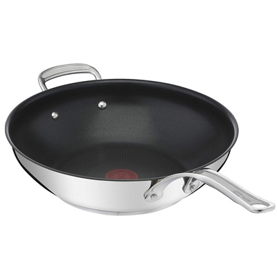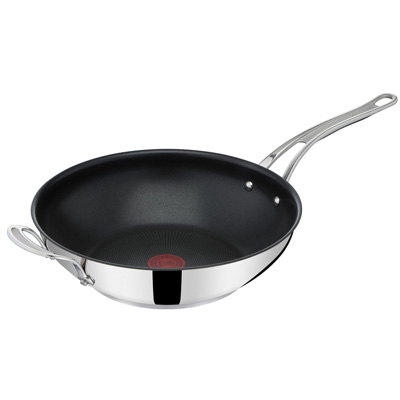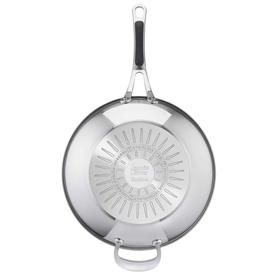 Die Tefal Wokpfanne E30688 Jamie Oliver Cook's Classic ist eine stylische Edelstahl-Pfanne, die so gut kocht wie sie aussieht - perfekt für ein Servieren direkt vom Herd auf den Tisch. Dank der widerstandsfähigen Antihaftversiegelung mit Titanverstärkung, lässt sich die Pfanne mühelos reinigen. Das Thermo Signal färbt sich einheitlich dunkelrot, sobald die Pfanne optimal vorgewärmt und bratbereit ist – perfektes Anbraten garantiert.