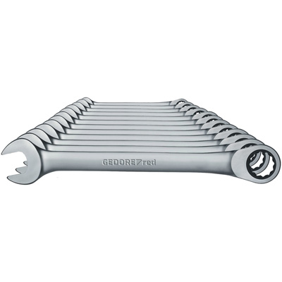 Der Ratschenmaulschlüssel-Satz R07105012 von Gedore Red enthält 12 Ringratschen-Maulschlüssel mit beidseitig gleichen Schlüsselweiten in einem Halter. Der Ratschenkopf ist gerade. Der Ratschenmechanismus ist feinverzahnt mit 72 Zähnen, der Rückschwenkwinkel beträgt nur 5°. Die Schlüssel sind aus Chrom-Vanadium-Stahl gefertigt und matt verchromt. Die Maulstellung beträgt 15°. Der Satz R07105012 ist in Anlehnung an DIN 3113, ISO 3318 hergestellt und enthält gängige Größen in praxisgerechter Zusammenstellung.