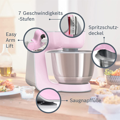 Die MUM58K20 Küchenmaschine von Bosch ist ein Universaltalent für häufiges Kochen und Backen. Sie besitzt sieben Schaltstufen bzw. Arbeitsgeschwindigkeiten plus einen Momentschalter zur individuellen Wahl der Arbeitsgeschwindigkeit. Durch das vielfältige Zubehör macht Kochen und Backen wieder richtig Spaß. Das Gerät nimmt alle Vorarbeiten ab, vom einfachen Mixen bis zum Teigrühren. Sie ist darüber hinaus mit einem 1000-Watt-Motor und einer elektronischen Drehzahlregelung ausgestattet. Gummisaugfüße verhindern ein Verrutschen auf glatten Arbeitsplatten und der Überlastungsschutz sowie die Wiedereinschaltsicherung sorgen für maximale Sicherheit. Des Weiteren ist umfangreiches Zubehör im Lieferumfang enthalten.