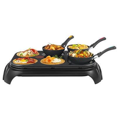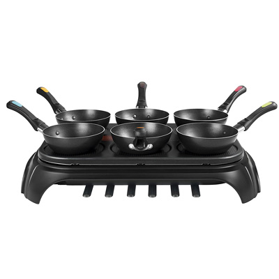 Das Tefal Mini Wok Set Wokparty Duo PY5828 bietet die Möglichkeit, gemütlich mit der Familie oder den Freunden am Tisch asiatische Speisen zuzubereiten. Mit 6 Wokpfannen kann sich jeder seine Lieblingszutaten zusammenmischen und leckere Gerichte kreieren. Die Grillplatte ist außerdem auch ohne die Pfannen verwendbar, z.B. für Crêpes oder Omlette.