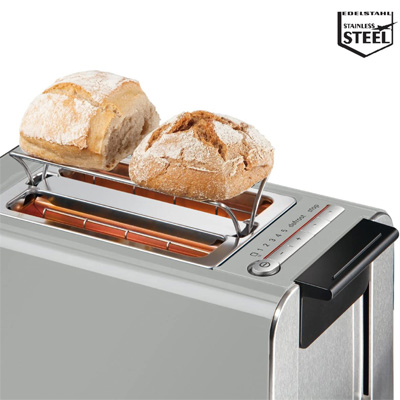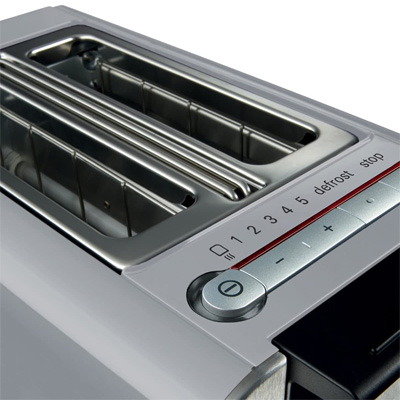 Der Siemens TT86105 Toaster bietet für zwei Toastscheiben Platz. Die elektronisch gesteuerte Röstgradkonstante sorgt für gleichbleibende Toastergebnisse. Die Auftaufunktion ermöglicht problemlos auch gefrorenes Brot zu toasten. Für Sauberkeit sorgt die herausnehmbare Krümelschublade. Die automatische Brotzentrierung ermöglicht eine gleichmäßige Bräunung.