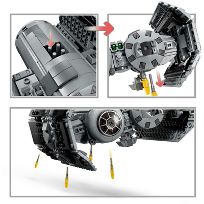 Der Lego 75347 Star Wars TIE Bomber begeistert Fans von Lego Star Wars ab 9 Jahren. Dieser Lego-Sternenjäger aus 625 Teilen verfügt über ein aufklappbares Cockpit mit Platz für eine Minifigur, eine Torpedo-Abwurffunktion und 2 Shooter. Das Set beinhaltet außerdem einen Lego Gonk-Droiden, 3 Lego-Minifiguren mit Blastern – Darth Vader, Vizeadmiralin Sloane und einen TIE Bomber-Piloten – sowie einen Wagen, um die Torpedos zum TIE Bomber zu bringen.