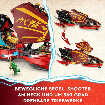 Über die neu verschmolzene Welt schweben die Ninja in ihrem Luftschiff! Arin und Sora findet man im Inneren des beeindruckenden Seglers, denn hier steht ein Spielautomat und die Kommandozentrale. Mit dem umfassenden Bau- und Spieleset Lego Ninjago Ninja-Flugsegler im Wettlauf mit der Zeit (71797) können Ninjago-Fans und versierte Baumeister die aufregenden Abenteuer und Actionszenen aus der TV-Serie Ninjago „Dragons Rising“ nachstellen und neu erfinden.