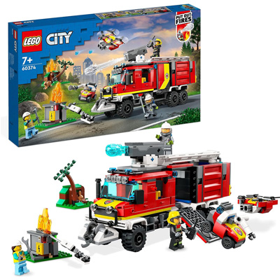 Mit diesem Lego-Set aus der Serie City lassen sich aufregende Löscheinsätze nachspielen. Das Spielzeug-Löschauto hat eine abnehmbare Einsatzleitstelle, eine Spielzeug-Löschdrohne und einen Roboter mit Gelenkarm an Bord. Mit der Löschkanone lassen sich die Flammen mit speziellen Wasser- und Schaumelementen bekämpfen. Mit dabei sind außerdem eine funktionierende Seilwinde und viel Zubehör wie ein Funkgerät, eine Feuerwehraxt, eine Kreissäge und ein Schraubenschlüssel. Außerdem laden Häuser- und Waldbrandkulissen zusammen mit 3 Feuerwehr-Figuren zu packenden Einsätzen ein.
