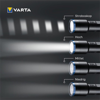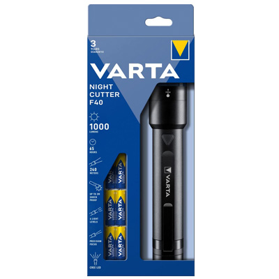 Die Taschenlampen der Serie Night Cutter von Varta überzeugen durch schlichtes, elegantes Design und hohe Leuchtstärke. Mit CREE-LEDs und Features wie Präzisionsfokus, Batteriestatusanzeige und Schutz gegen Spritzwasser sowie verschiedene Leuchtstufen bieten sie breite Funktionsvielfalt. Die Night Cutter F40 erzeugt einen Lichtstrom von bis zu 1000 Lumen bei einer Leuchtdauer von bis zu 65 Stunden und einer Leuchtweite von bis zu 240 Metern. Sie wird über 6 AA-Batterien mit Strom versorgt.