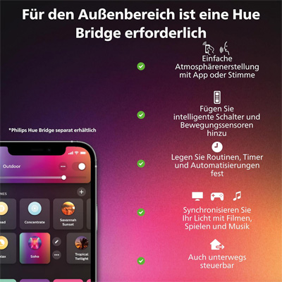 Die neue Philips Hue Dymera Wandleuchte lässt sich nahtlos in Dein smartes Philips Hue Lichtsystem integrieren. Schaffe eine Harmonie der Farben in Deinem Zuhause, egal ob auf Deinem Balkon, Terasse oder Hauseingang. Deine Dymera verwandelt dabei jede Umgebung in eine schöne Atmosphäre. Erschaffe Deinen persönlichen Look durch den Multi-Source-Lighting-Effekten, mit unterschiedlichen abstrahlenden Farben nach unten und oben. Wähle aus 16 Millionen Farben und verschiedenen kühlen bis warmweißen Tönen, um für jeden Moment die passende Stimmung zu erzeugen. Nutze dabei Bluetooth zur sofortigen Lichtsteuerung oder verbinde die Hue Bridge Steuerzentrale, um den vollständigen Funktionsumfang Deines Philips Hue Lichtsystems zu genießen.