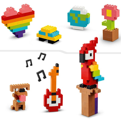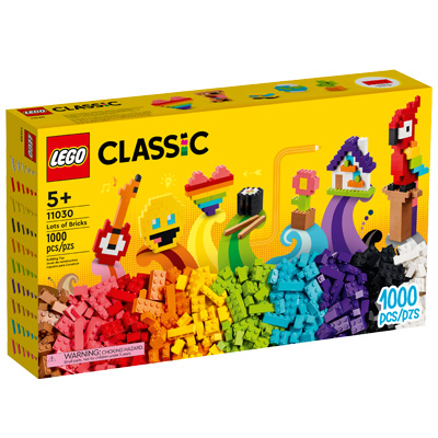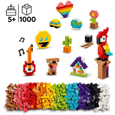 Mit diesem Kreativ-Bauset aus der Serie Lego Classic steht ein Set mit besonders hohem Spielwert bereit. Es enthält 1000 Bausteine in 10 leuchtenden Farben - darunter auch den äußerst beliebten 2x4-Stein aus den Anfangstagen von Lego. Mit gedruckten Bauanleitungen lassen sich unter anderem ein Auto, ein Globus, eine Blume, ein Herz, eine Gitarre, ein Haus, ein Smiley-Emoji, ein Papagei, ein Hund und ein Apfel bauen. Darüber hinaus gibt die große Menge an Steinen die Möglichkeit, der eigenen Kreativität freien Lauf zu lassen.