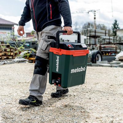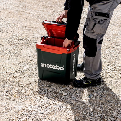 Die Kühlbox aus dem Hause Metabo dient zum aktiven Kühlen oder Warmhalten und das sogar ohne netzgebunden sein zu müssen. Der bürstenlose Motor mit optionalem EcoModus sorgt für eine längere Laufzeit im Akkubetrieb. Dank der großzügigen Innenmaße passen sogar große 1,5 Liter PET-Flaschen hinein. Die einschiebbaren Trenngitter sorgen für die bestmögliche Ordnung in der Box. Ein sicheres Verschließen der Box gewährleistet der schwenkbare Griffbügel. Das integrierte Depot sorgt für den notwendigen Platz für die beiden mitgelieferten Anschlusskabel. Selbstverständlich ist die Metabo KB 18 BL Akku Kühlbox mit den metaBOXEN kompatibel. Ob Akku, KFZ Ladekabel oder Netzstecker, die Kühlbox kann mit allen betrieben werden. Metabo verbindet eine lange Tradition zu Werkzeugen aller Art, darüber hinaus ist Metabo Mitglied im CAS Konzern und besitzt somit eine breite Palette an kompatiblen Geräten und Akkus anderer Hersteller.