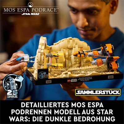 Dieses Lego-Set hält einen packenden Moment aus der Welt von Star Wars als Diorama fest: Es zeigt die Szene, in der Anakin Skywalker in "Star Wars: Die dunkle Bedrohung" in seinem Podracer den Rivalen Sebulba durch einen Felsbogen in einer Schlucht verfolgt. Dieses Set aus 718 Teilen bietet Bauspaß für Erwachsene und ist ein tolles Objekt zum Ausstellen - für Fans von Star Wars, die ihre liebsten Filmszenen präsentieren möchten. Das Modell mit einer Breite von 30 Zentimetern wird durch eine Plakette mit Qui-Gon Jinns Ratschlag „Remember. Concentrate on the moment. Feel. Don't think. Trust your instincts“ und einem Lego-Stein zur Feier des 25-jährigen Jubiläums von Lego Star Wars komplettiert.