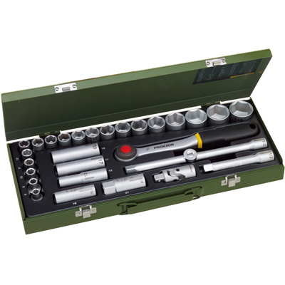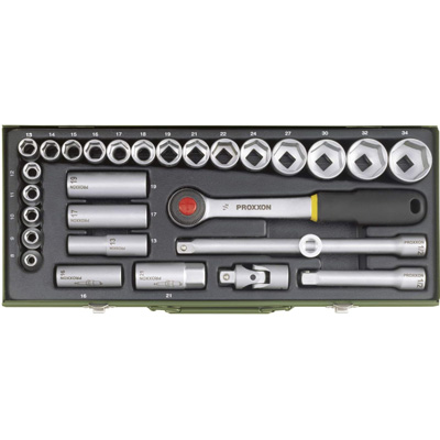 Der Proxxon Industrial Steckschlüsselsatz kommt im stabilen, pulverbeschichteten Stahlkasten. Aus hochwertigem Werkzeugstahl Chrom-Vanadium 31CrV3 geschmiedet, erreichen die Proxxon Steckschlüsselsätze ideale Werte in Sachen Festigkeit und Zähigkeit. Härte und maximales Drehmoment sind dadurch deutlich höher, als von DIN/ISO gefordert. Für einen optimalen Schutz der Oberflächen werden die Werkzeuge zweimal vernickelt und anschließend mattverchromt. Der Stahlkasten besitzt verwindungsfeste, unverwüstlichen Formeinlage aus gespritztem Polypropylen. Zudem ist er ölfest, säurefest, und leicht zu reinigen. Dank der dauerhaft gut lesbaren Markierungen für alle Schlüsselweiten ist das benötigte Werkzeug leicht zu finden.
