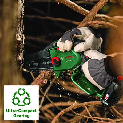 Die kabellose Bosch Kettensäge EasyChain 18V-15-7 bietet eine hohe Schnittgeschwindigkeit von 6,95m/s, und die hochwertige Sägekette von Oregon schneidet durch Holz bis 13cm Durchmesser. Sie eignet sich ideal für alle Ausastungs- und Sägearbeiten mit beeindruckenden 160 Schnitten pro Akkuladung. Das SDS-System von Bosch ermöglicht das werkzeuglose einfache Spannen und Wechseln der Sägekette. Das kompakte, gut ausbalancierte Design und Handgriffe mit Softgrip ermöglichen müheloses Arbeiten. Die integrierte Bosch Syneon Technology sorgt für optimale Leistung und maximale Akku-Laufzeit. Die Akku-Kettensäge EasyChain 18V-15-7 ist Teil des 18V POWER FOR ALL-Systems. Ein einziger Akku kann für alle 18V POWER FOR ALL-Werkzeuge und Gartengeräte verwendet werden.