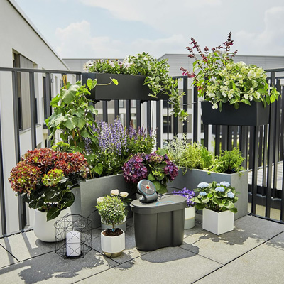 Das Gardena AquaBloom Set bietet die ideale Lösung zur Bewässerung für Balkone und Terrassen ohne Wasser- und Stromanschluss. Das solarbetriebene AquaBloom Set benötigt weder einen Strom- noch einen Wasseranschluss und versorgt die Pflanzen mit der optimalen Menge an Wasser, ideal für die Urlaubs- und Reisezeit oder auch die ganze Saison über. So werden die Pflanzen perfekt gepflegt, auch wenn niemand daheim ist. Im AquaBloom Set ist ein passender Wasserbehälter mit 10,5 Litern Volumen bereits enthalten.