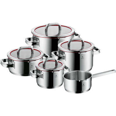 Das WMF Function 4 Topfset entstand zusammen mit dem Designbüro NOA Aachen, für die Topfdeckel stand der MP3-Player iPod von Apple Pate. Gefertigt aus Edelstahl und Silikon, besitzt der Deckel vier verschiedene Funktionen – angelehnt an das Bedienrad vom iPod. Praktisch, denn je nach Position lassen sich Flüssigkeiten mit geschlossenem Deckel ganz oder kontrolliert abgießen: Durch die großen Sieböffnungen entweicht das Kochwasser, die Nudeln bleiben im Topf. Dasselbe funktioniert mit den kleinen Sieböffnungen für Reis. Die geschlossene Position ist für wasserarmes Garen gedacht und die offene, um Flüssigkeiten voll abzugießen. Der rote Ring im Deckel ist ein echter Hingucker. Aus hitzebeständigem Silikon gefertigt, sitzt er immer fest im Topf. Die Wärmeübertragung der Hitze wird durch die speziellen Hohlgriffe verringert, daher bleiben sie länger kühl.