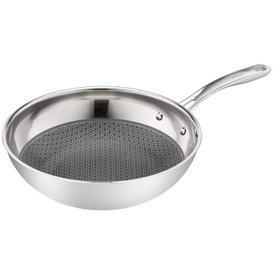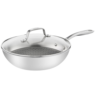 Die Eternal Mesh Wok-Pfanne von Tefal kombiniert die Vorzüge der Edelstahlpfanne mit denen einer kratzfesten Mesh-Versiegelung, um perfekte Bratergebnisse zu erzielen. Der dreischichtige Pfannenboden (Edelstahl / Aluminium / Edelstahl) sorgt für eine perfekte Hitzeverteilung und für gleichmäßige, köstliche Garergebnisse. Die extra tiefe Form eignet sich ideal für köstliche Schnellbratgerichte. Außerdem ist die Pfanne mit einem ergonomisch geformten Edelstahlgriff ausgestattet, der sicheren und komfortablen Halt bietet. Die edle Wok-Pfanne eignet sich für alle Herdarten (Gas, Elektro, Keramik und Induktion). Sie ist besonders vielfältig in der Küche einsetzbar und lässt sich mühelos reinigen.