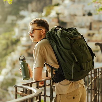 Der Farpoint 40 von Osprey ist ein leichter und vielseitiger Reiserucksack mit reichlich Stauraum, der sich als Handgepäck im Flugzeug einsetzen lässt. Dank seines hochwertigen und belastbaren Rückensystems bietet er hohen Tragekomfort auch bei größeren Lasten. Der Farpoint hat gepolsterte Tragegriffen oben und an den Seiten und lässt sich damit wie eine Reisetasche schnell und einfach vom Gepäckband nehmen. Das Tragesystem lässt sich komplett verstauen, so dass der Farpoint auch als Reisetasche einfach zu handhaben ist. Und dank des Kompressionsriemensystems bleibt auch bei Erschütterungen alles zuverlässig an seinem Platz. Dieser Rucksack wurde aus Materialien hergestellt, die aus Recycling gewonnen wurden.