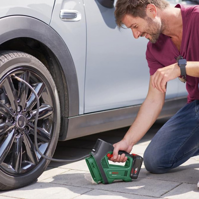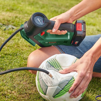 Die Akku-Luftpumpe UniversalPump 18V von Bosch pumpt bis zu 30 Liter pro Minute, dabei ist sie bequem und intuitiv in der Anwendung. Sie ist bestimmt zum Aufpumpen von Fahrrad-, Motorrad- und Autoreifen sowie kleinen aufblasbaren Spiel-, Sport- und Strandartikeln. Sie ist nicht zum Aufpumpen von großvolumigen Aufblasartikeln (z.B. Luftmatratzen) geeignet. Als Akku-Werkzeug kann sie unterwegs an jedem Ort verwendet werden und mit der durch einfachen Fingerdruck bedienbaren Ein-Aus-Taste ist sie schnell gestartet. Das beleuchtete Manometer zeigt die Druckmesswerte gut lesbar an und das eingebaute LED-Licht erleichtert das Pumpen bei schlechten Lichtbedingungen. Nach dem Aufpumpen können alle Zubehörteile (Kugelnadel, Sclaverand-Ventilaufsatz, Ballonaufsatz) und der Schlauch im Staufach direkt an der Werkzeugvorderseite untergebracht werden. Die Akku-Luftpumpe UniversalPump 18V ist Teil der POWER FOR ALL ALLIANCE, ein einziger Akku kann eine Vielzahl von Geräten verschiedenster Marken betreiben.