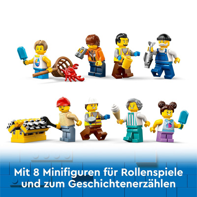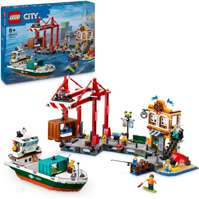 Am Hafen von Lego City werden viele Waren verladen und verschifft. Dafür gibt es einen großen Lego-Kran, mit dem Container von einem Schiff abgeladen werden können. Dieses Schiff kommt mit zwei Containern - zum Spielen sind der Maschinenraum, die Brücke und der Rumpf des Frachtschiffs zugänglich. Der Hafen hat auch einen touristischen Bereich mit Laden, Fischrestaurant und einem Strand. Acht Minifiguren laden zum fantasievollen Spielen ein - genau wie das vielfältige Zubehör dieses aus 1226 Teilen bestehenden Sets. Unter anderem sind ein kleineres Boot, ein Wassermotorrad, ein Krabbennetz mit Krabbe und eine Angelrute enthalten.