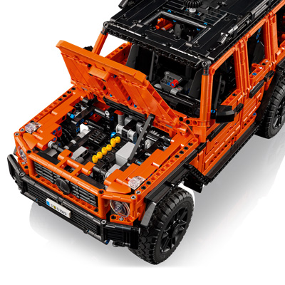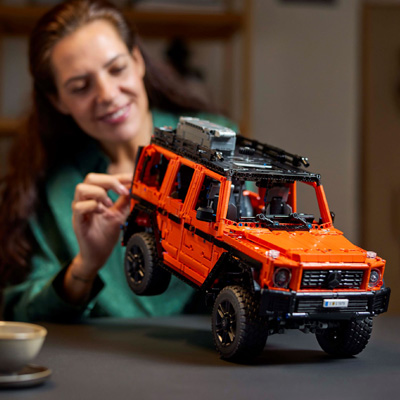 Ab ins Gelände mit diesem tollen Set aus der Serie Lego Technic! Das Modell eines Mercedes-Benz G 500 PROFESSIONAL Line feiert das 45-jährige Jubiläum dieses legendären Geländewagens und kommt fertig gebaut auf eine beindruckende Länge von 43 Zentimetern. Viele authentisch gestaltete Details und coole Funktionen begeistern Lego-Fans und Technik-Interessierte: Die Motorhaube des Fahrzeugs kann geöffnet werden - darunter befindet sich ein Sechszylinder-Reihenmotor. Das Getriebe verfügt über drei Einstellungen - D, N und R - und zwei Differentialsperren. Werden die Türen geöffnet, ist der Blick auf den detailliert gestalteten Innenraum frei. Auch die Hecktür lässt sich öffnen. Auf dem Dach befindet sich ein Gepäckträger mit Leiter und Ersatzrad. Insgesamt entsteht dieses Modell aus 2891 Teilen - eine Herausforderung für geübte Lego-Konstrukteure!