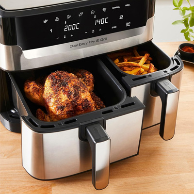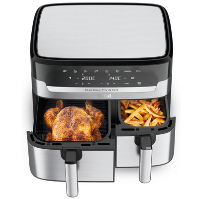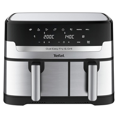 Die Dual Easy Fry & Grill von Tefal, eine 8,3 Liter Doppelkammer-Heißluftfritteuse, bereitet im Handumdrehen ein komplettes Gericht für die ganze Familie zu, und das in einer perfekten Zeit. Dank der zwei unabhängigen Schubladen können zwei unterschiedliche Speisen gleichzeitig frittiert werden. In die XXL-Schublade passen große Zutaten wie ein Sonntagsbraten, während beide Schubladen zusammen großzügige Portionen von Pommes Frites und mehr zubereiten können. Dank der zwei unabhängigen Garzonen können die Kochprogramme, Garzeiten und Temperaturen in beiden Schubladen individuell eingestellt werden. Mit der SYNC-Funktion können die unterschiedlichen Zubereitungszeiten aufeinander abgestimmt werden und alles kann zur gleichen Zeit serviert werden.